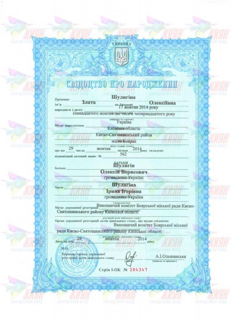 Повне ім’я: Шулигіна Злата Олексіївна, 17.10.2014 р.