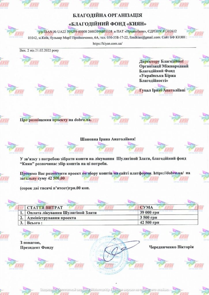 Злата Шулигіна – це 7-річна дівчинка, яка хворіє на ДЦП, спастичний тетрапарез, симптоматичну епілепсію, псевдобульбарний синдром і затримку психомоторного розвитку. Злата народилася напівмертвою. Вона не дихала і не закричала. На превелике щастя, крихітка вижила. Згодом у неї сталося гiпоксично-iшемiчнне ураження ЦНС, Злата пережила набряк головного мозку та крововилив у мозок.
