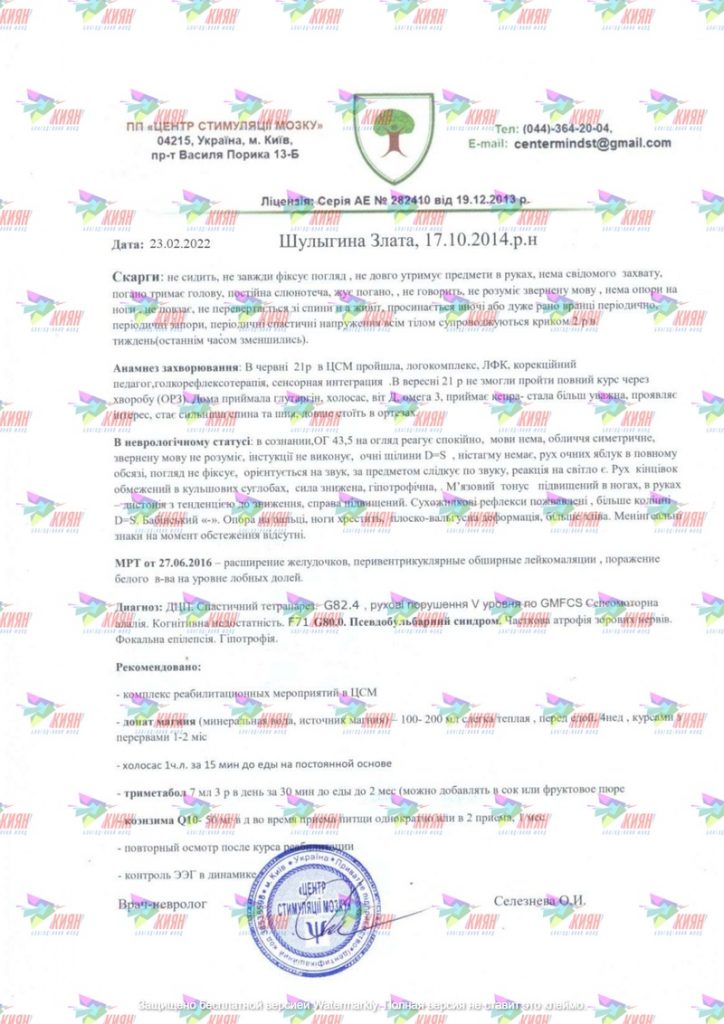 Діагноз: ДЦП, спастичний тетрапарез, симптоматична мультифокальна епiлепсiя, iнфантильнi спазми, псевдобульбарний синдром, затримка психомоторного розвитку
