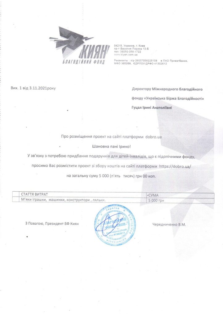 Щороку напередодні новорічних та Різдвяних свят наша організація проводить акцію, під час якої ми даруємо хворим діткам – нашим підопічним – подарунки. Хтось із них хоче м’яку іграшку, хтось машинку, конструктор чи ляльку. Хтось із них хоче м’яку іграшку, хтось машинку, конструктор чи ляльку.
